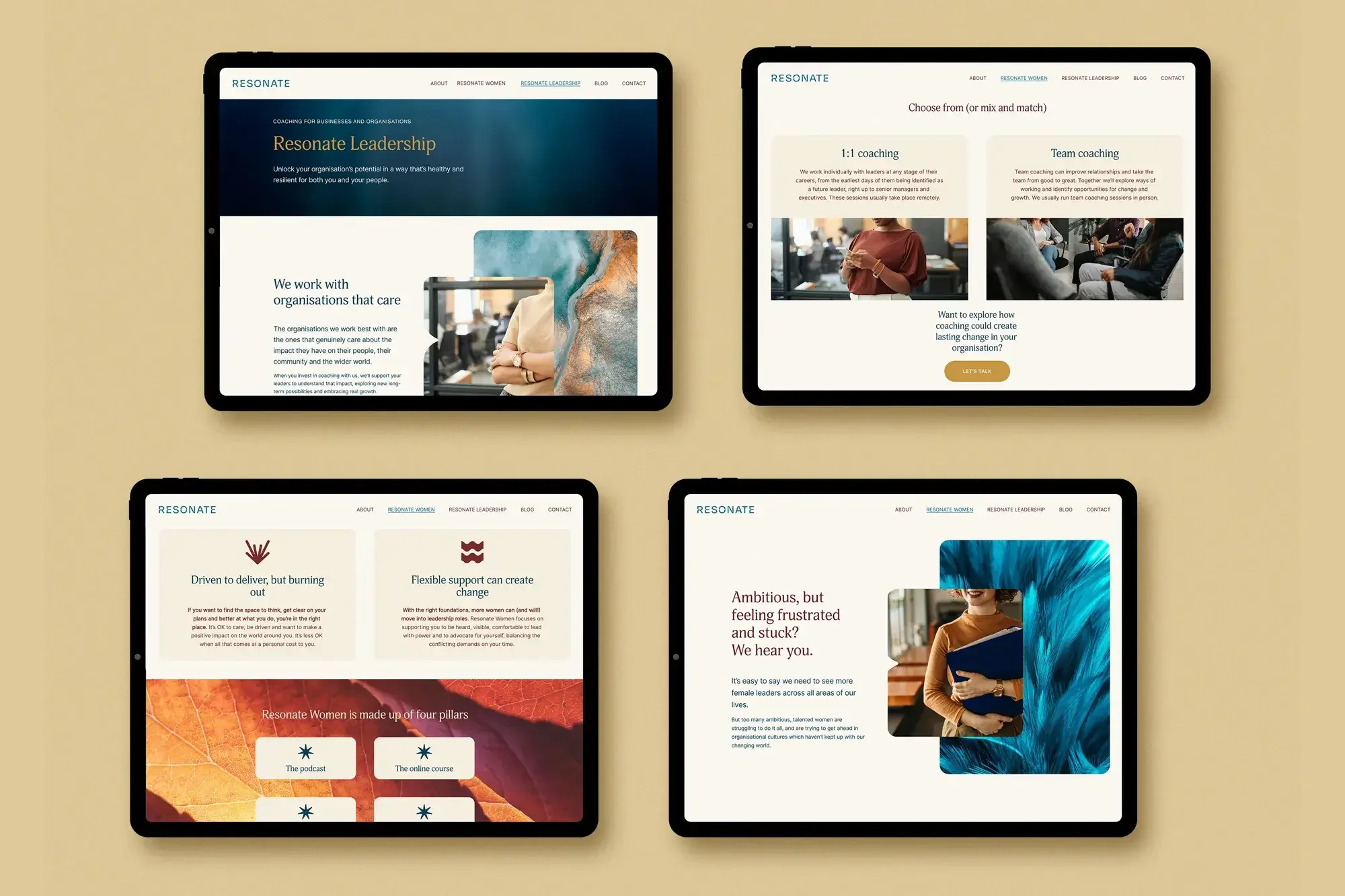 The new Squarespace website design feels warm, intuitive and organic – guiding visitors to the right support without distraction. Copywriter Megan Rose brought the Resonate voice to life beautifully, crafting words that balance professionalism with personality, and clarity with empathy.